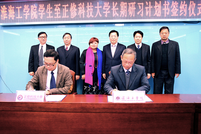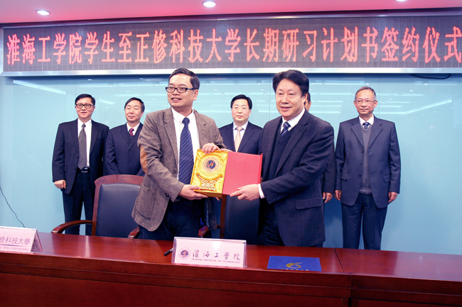 签约仪式上,赵晓江向正修科技大学捐赠授课钟点费,并与正修科技大学共同设立学生奖助学金用来资助我校学生赴正修科技大学进行学期交流。《淮海工学院学生至正修科技大学长期研习计划书》的签订掀开了我校与正修科技大学合作交流的崭新篇章。