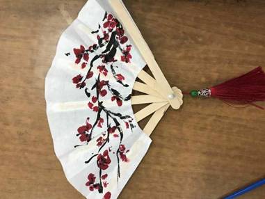 在同学们的互帮互助中,大家渐渐得心应手,做出了令人满意的扇子。还有一位社团的小成员为大家提笔画梅花,朵朵红梅将中外友谊深深地融入其中。