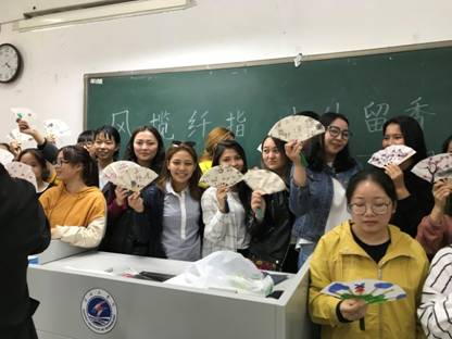 10月14日下午2时,由绘心工艺社举办的“风揽纤指 中外留香——中国风折扇制作“活动,于苍梧校区文通楼107教室顺利举行。参加本次活动的有绘心工艺社的社员、我校留学生和志愿者同学。本次活动主要是教同学们如何制作折扇,以此来增进中外同学之间的友谊,使我校留学生们更好的了解中国的传统文化。