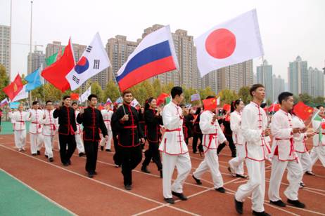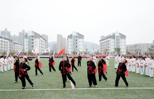 开幕式伊始,留学生们身着黑白两色的中国传统服装进行了一段太极表演。充分展示了剑术扇舞的刚柔并济,书法与功夫的文武双修。在结合了中国戏曲和西方流行的背景音乐下,他们用自己的表演传达了对中国文化精髓的理解,用极富表现力的律动,带来了一场富有活力的视听体验。随后的走方阵过程中留学生们手举本国国旗步入会场,他们面带笑容,不时挥动着手中的国旗兴致勃勃地与热情的观众挥手致意,气氛热烈。