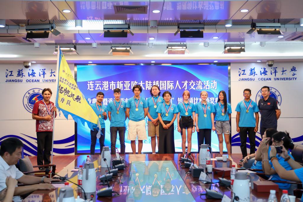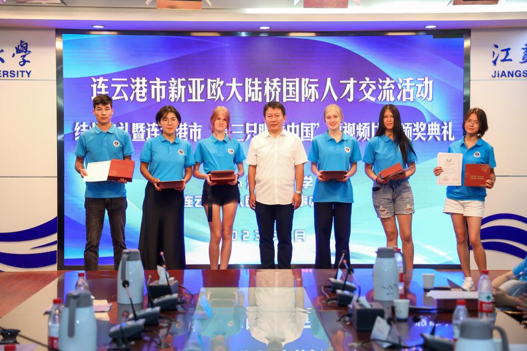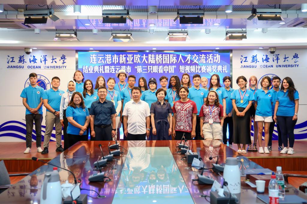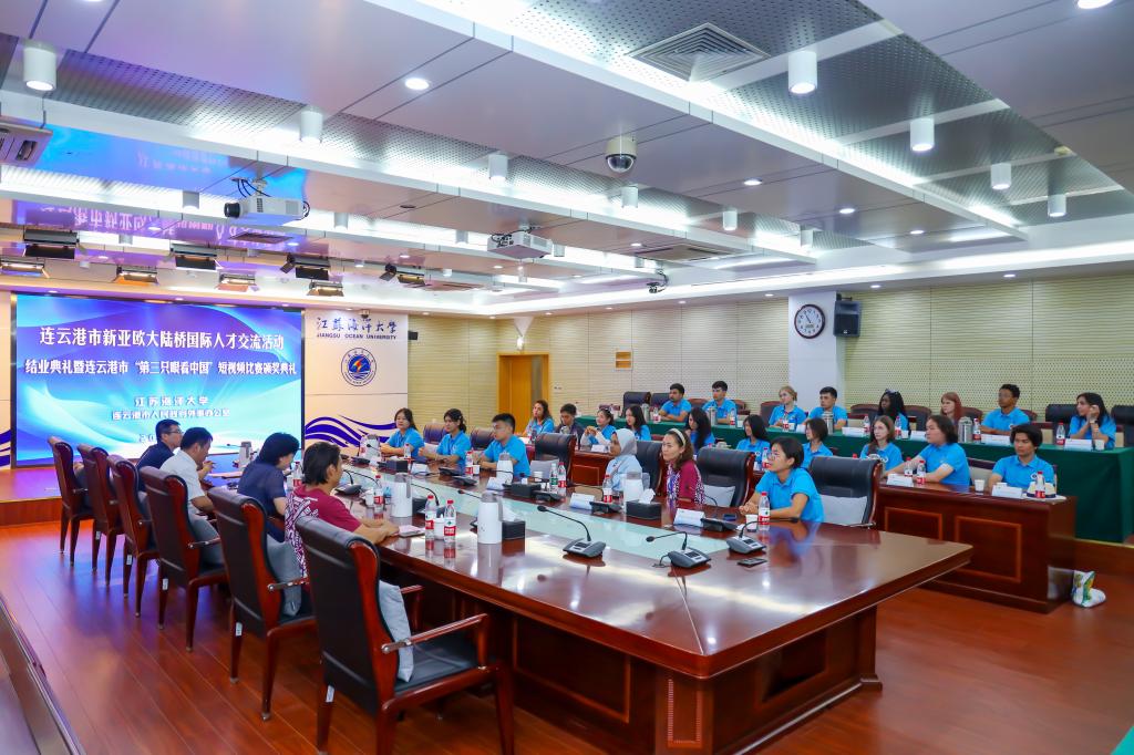 8月4日,我校在会议中心东海厅举办连云港市新亚欧大陆桥国际人才交流活动结业典礼暨连云港市“第三只眼看中国”短视频比赛颁奖典礼。哈萨克斯坦阿斯塔纳国际大学中哈经贸学院负责人AKNIYAZOV TIMUR、连云港市人民政府外事办公室副主任刘鹏达出席典礼,我校国际交流与合作处处长韩小杰、体育学院院长赵宏以及连云港市新亚欧大陆桥国际人才交流活动全体学员及带队教师参加典礼,典礼由国际交流与合作处处长韩小杰主持。