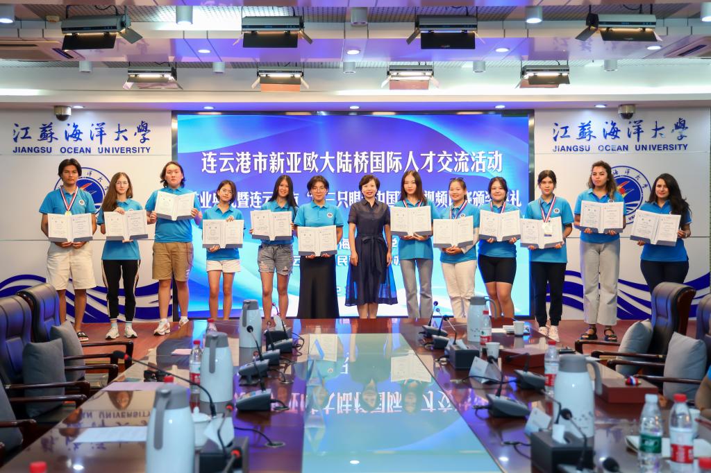 连云港市人民政府外事办公室副主任刘鹏达为连云港市“第三只眼看中国”短视频比赛获奖学员颁发了荣誉证书。