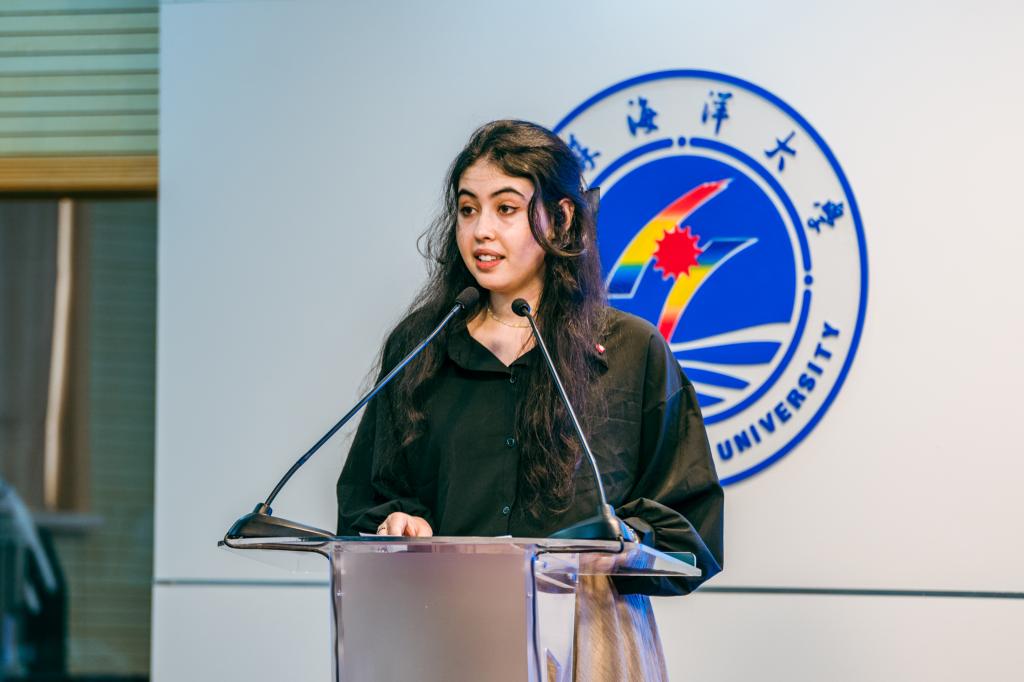 韩小杰致欢迎辞。韩小杰向莅临我校的各位领导、师生表示热烈欢迎,并向与会人员从办学规模、专业设置、学科特色、“向海”发展、国际交流合作与国际人才培养等方面介绍了我校基本情况。韩小杰表示非常荣幸本次连云港国际青年人才对话活动能在我校举行,为我校承办的连云港市新亚欧大陆桥国际人才交流活动全体学员及我校在校留学生与国际青年人才深度交流互动提供了难得的机会,希望所有在座的国际青年人才畅所欲言,以青年智慧助力区域高质量协同发展,以世界眼光和青年视角为全球和平发展和交流互鉴建言献策。