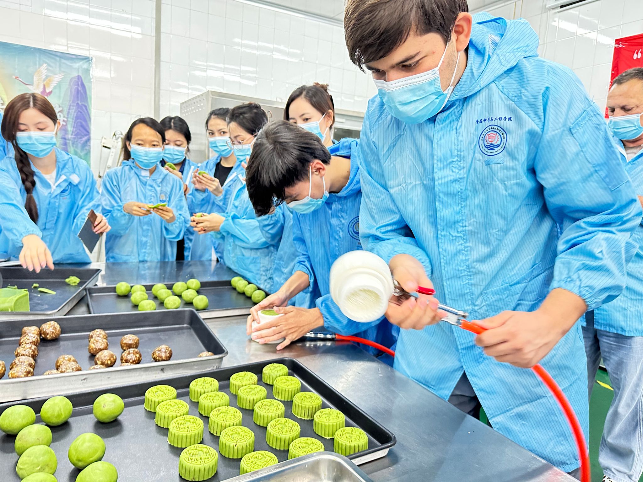 活动中,外籍师生在海洋食品与生物工程学院老师的指导下制作了月饼,亲身体验了月饼馅料称重、包馅、成型、脱模、烘烤、包装全过程。大部分外籍师生是第一次制作月饼,活动现场气氛热烈,大家纷纷表示制作月饼的过程非常有趣。来自摩洛哥的李天珞(ERRAOUI ASMAE)同学说:“我们国家过节日时,也会制作一些美食,和家人一起分享,很期待品尝我自己制作的月饼”。