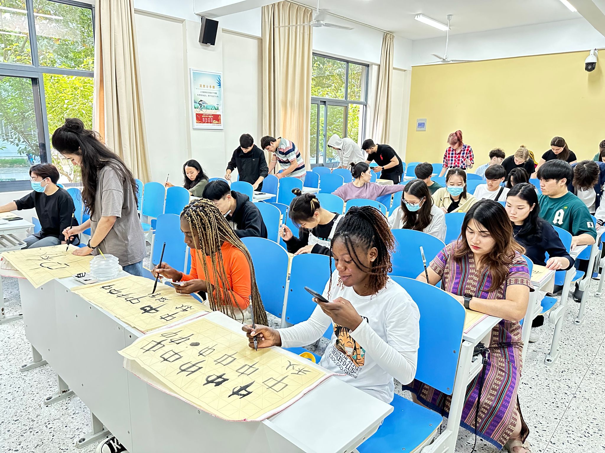活动还组织留学生们体验了中国书法文化。来自越南的陈氏叶竹(TRAN THI DIEP TRUC)同学分享了她的中秋主题书法作品,并指导留学生们现场创作书法作品。创作完成后,留学生们踊跃上台展示自己的书法作品,交流分享创作理念。