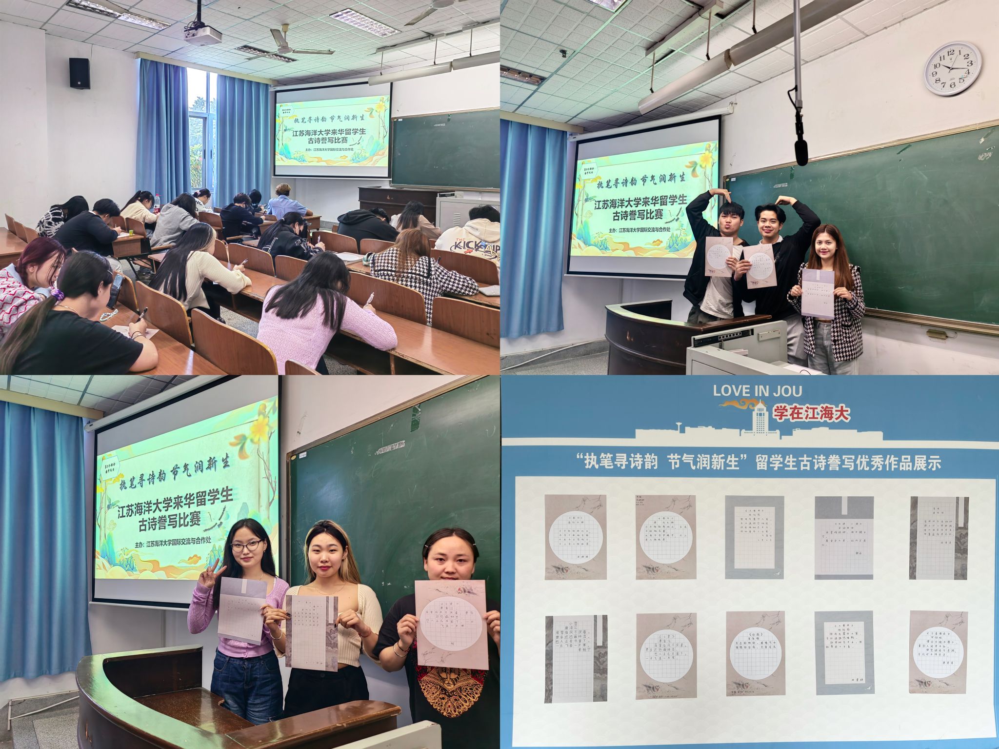 4月16日下午,“执笔寻诗韵节气润新生”江苏海洋大学来华留学生古诗誊写比赛在文通楼302室举行,留学生们挥笔写下与传统节气相关的古诗词,领略中华文化,感受汉字魅力。