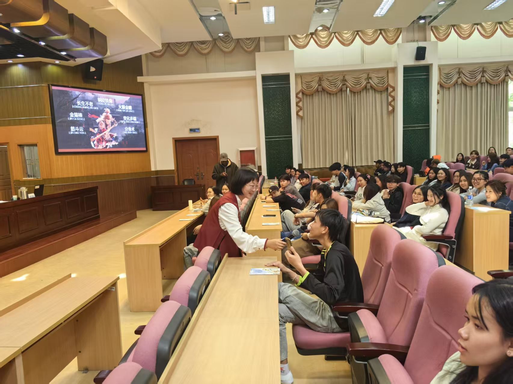 “西游妙语”文化讲座在文博楼报告厅举行,讲座由文法学院许墨老师主讲。留学生通过《西游记》影视片段赏析,深入了解“长生不老”“火眼金睛”等成语的来源与文化内涵。